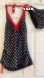 Black printed with large white polka dots and red trim.