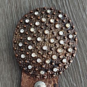 Leather is soft and supple with a beautiful embossed Alligator Design. The oval buckle is a show stopper with a burnished copper tone, clear rhinestones, and copper tone studs throughout.