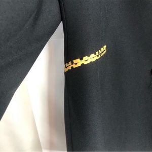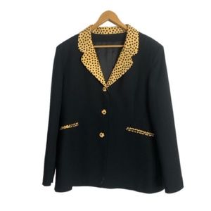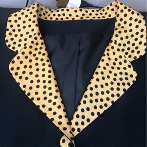 Black blazer with yellow/marigold polka dot trim and buttons. Faux pockets. Lined