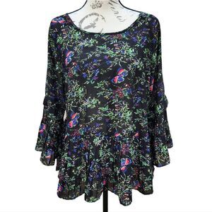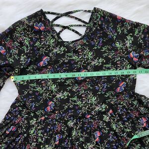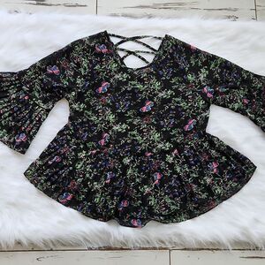 Entro black floral print blouse, bell sleeves, pleated hem, round neck, crisscross back, flowy fit, tunic blouse, 3/4 sleeve