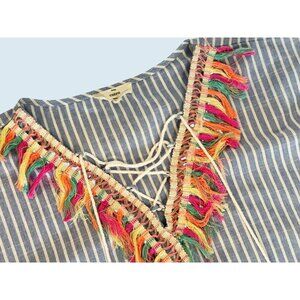 Great tunic top / cover-up by Entro. Blue and white striped. Neon fringe. Lace up V neck with tassel. Pullover. Lightweight. 100% cotton. Size large. Pre-owned and gently worn in really nice condition!