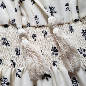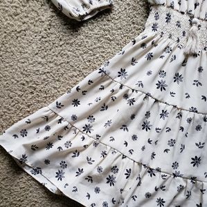 ENTRO Blue Floral ruffle short dress. V-neck line with tie tassel, long sleeves, lined, clinched waistband. In excellent hardly worn condition (worn once). No ripes, holes or werid smells to this item.