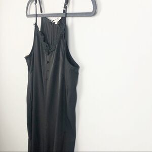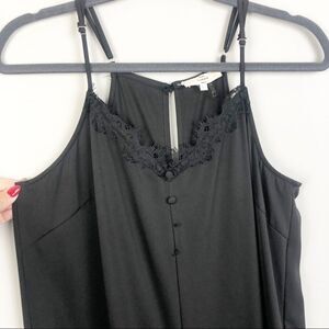 Super cute cropped Gaucho style black jumpsuit by ENTRO. Purchased at a boutique. Adjustable thin straps. Lace detail at the bust. Buttons down the front (2 fell off as shown but it does come with 2 extra you can sew on). Keyhole button back. Step in. Great preowned condition (other than missing buttons). Size Large.