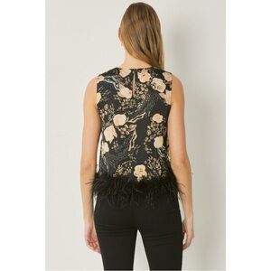 Chic sleeveless top with floral pattern. Features a stylish feather hem. Ideal for a fashionable look. Print round neck sleeveless top featuring faux feather trim at hem. Keyhole button closure at back. Lined. Woven. Non-sheer. Lightweight 18-19.5 PTP