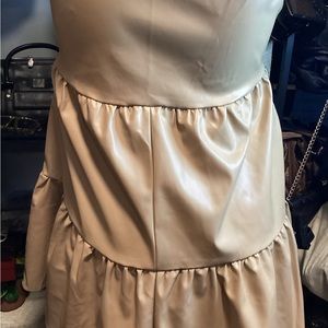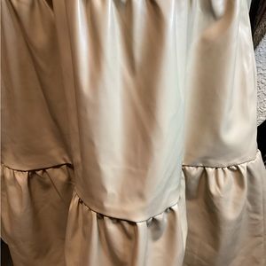 Faux leather tiered mini dress featuring ruffle sleeves. Pockets at side. Unlined. Woven. Non-sheer. Lightweight.