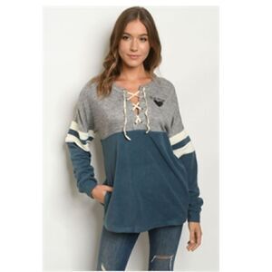 Entro—Soft and Sporty Grey and Teal tie front sweater