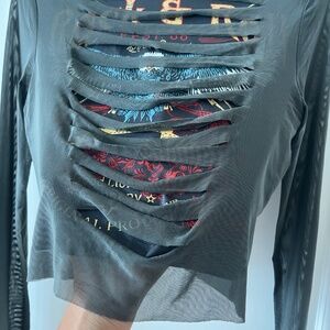 Edgy ENVME long sleeve mesh top featuring a bold “Rock & Roll” graphic with eagle print and distressed horizontal cutout details on the front. Made from lightweight, sheer mesh (95% polyester, 5% spandex) with a cropped fit, perfect for layering over bralettes or tanks. Statement piece for concerts, festivals, or night-out looks. Excellent condition. Never worn.