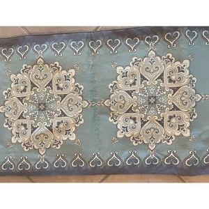 Add timeless sophistication to your table with this gorgeous EnVogue table runner. Featuring a rich teal-blue base with intricate ivory damask embroidery and heart scroll accents along the border, this runner is perfect for adding a touch of elegance to your dining room, entryway, or sideboard.