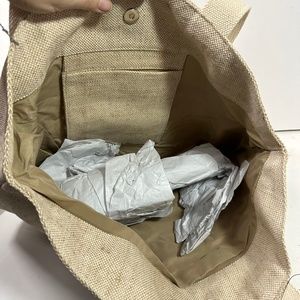 ENVY Yellow Stitch ‘Play’ BEACH BAG TOTE CARRY BURLAP SNAP 19 X 16 Handcraft New