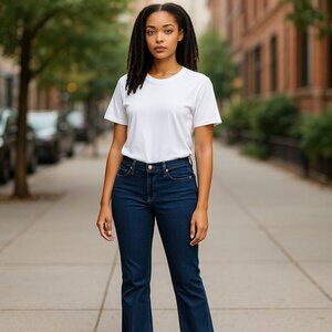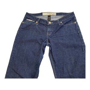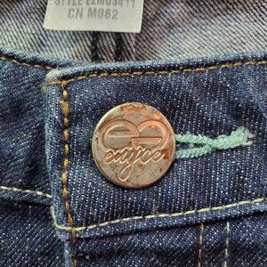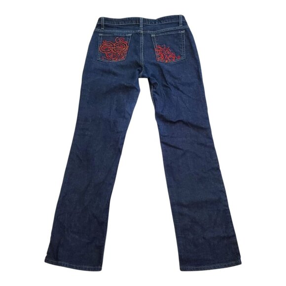 Enyce brand jeans, featuring a dark wash denim and embroidered designs on the back pockets. Enyce was a popular brand in the late 1990s and early 2000s, known for its streetwear and hip-hop inspired clothing. These jeans have a bootcut leg style. The embroidered patterns on the back pockets are a signature detail of Enyce jeans.