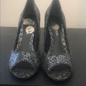 Black heels with silver sparkles throughout. Only worn once! Stickers from the store left marks inside the shoe but otherwise great condition. 4” heel.