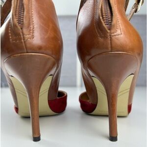 Brown leather wrapped 3.5" stiletto heel with double ankle strap and zipper closure. Red suede slightly pointed toe. Smoke free home.
