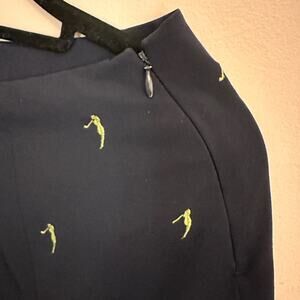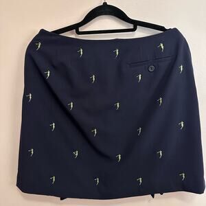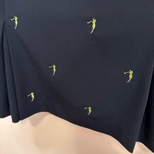 Excellent condition. The color is a dark navy blue with line green embroidered golfers. It has a pleated skirt style in the front, and zipper closure on the side. Has pockets and and shorts underneath.