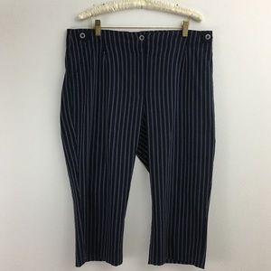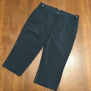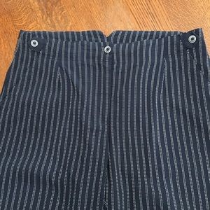 Navy blue with white stripe stitching. Two front hand pockets & one back buttoned pocket. Front zipper with single button closure & single hidden button. Measurements flat are approximately 17.75” waist, 11” rise & 19.25” rise. High stretch content is 65% Rayon, 23% Nylon, 9% Polyester & 3% Spandex. In excellent like new condition with NO spots or damage.