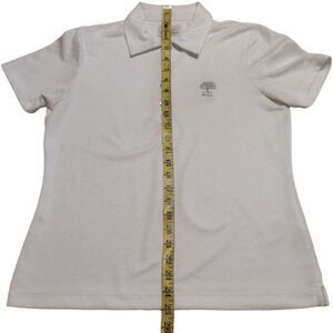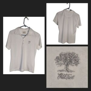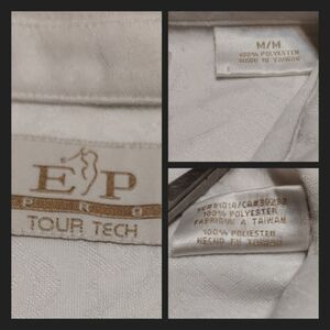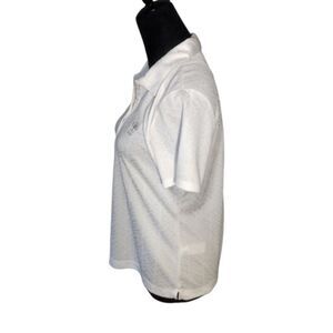 Elevate your golf wardrobe with this stylish EP Pro Tour Tech Women's White Polyester Golf Polo Athletic T-Shirt Top Size Medium. Featuring a solid white shirt with a cute little pattern all over, this shirt is made with a knit fabric that includes 100% polyester for easy care. The shirt's short sleeves and breathable, moisture-wicking fabric make it perfect for wearing in any season and any activity, whether traveling, playing golf, or just enjoying a casual day out. Embroidered with the Oak Tree Logo and designed with a spread collar and button closure, this polo shirt is functional and fashionable.