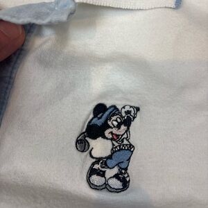 • Design: White cotton polo with pale blue trim, embroidered Mickey golfing on chest