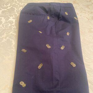 Capri Pants: 32"L; 15" Waist - Size 6 - Navy Blue w/Color Olive Green Pineapples - 97% Cotton/3% Spandex - Zip w/button closure - Front & Back pockets