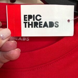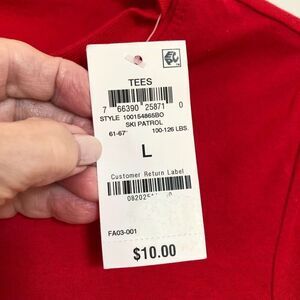 Epic Threads makes this kids size large “Ski Patrol” long sleeve, crewneck tee (100 to 125 lbs). it’s 60%, cotton and 40% polyester, so machine wash and tumble dry. The pit-to-pit measurement is 18”, the length is 25” and the sleeves are 22”. Basic, versatile, and NWT!