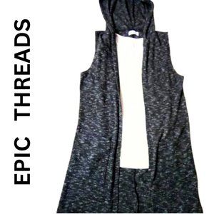 Long Sleeveless Hooded Cardigan by Epic Threads in Black variegated pattern.