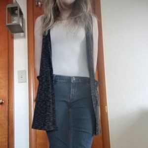 Tags: Long Line, Hooded, Variegated, Pockets, Relaxed, Layer, Sleeveless, Duster, Micro Ribbed, Black, Minimalist, Simple, Open, Light