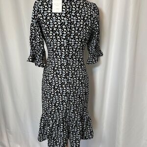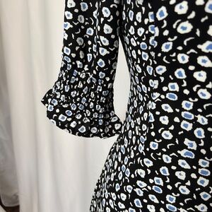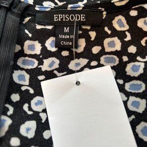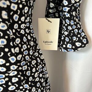 EPISODE LOS ANGELES black print dress with 3/4 length sleeves and a flounced hem. Size Medium. Polyester. Comes from a smoke-free home.