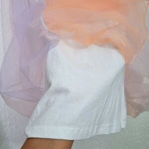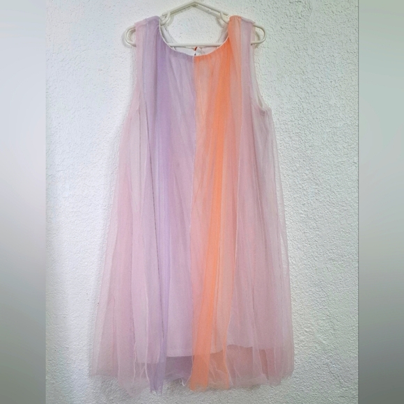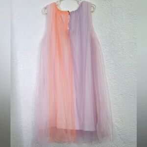 Adorable sleeveless dress from EPK (designed in France) Features soft pastel peach and lavender panels with a flowy layered tulle overlay—perfect for parties, special occasions, or twirling around at home. Lightweight and comfortable with an easy fit.