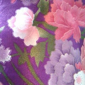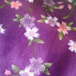 Pretty satin robe to cover up. Flowers on a purple background. Tie at waist. Kimono sleeves. 54 at chest, 52 at bottom hem. Wrap front and tie. Be comfy and beautiful working from home or just relaxing.