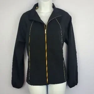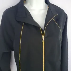 Golf jacket with gold piping trim. Has gold lining throughout and zips in front.