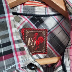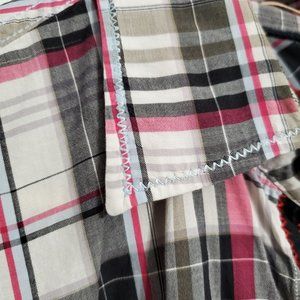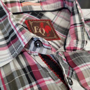 EQ Rooster by Equilibrio Men's Medium/Large Grey and Red Check Short Sleeve Button-down. Soft light weight cotton fabric. Lots of stitching details. Like new condition.