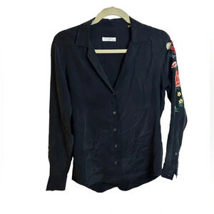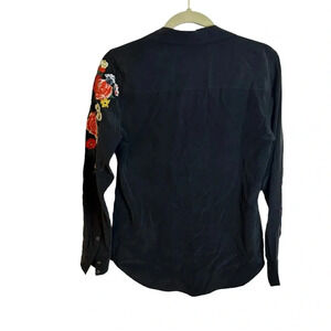 Pre owned excellent condition. Worn a handful of times. Stunning black silk blouse with floral embroidery on left arm. WOMENS size xs.