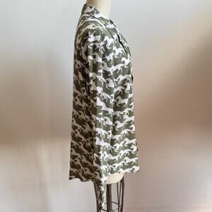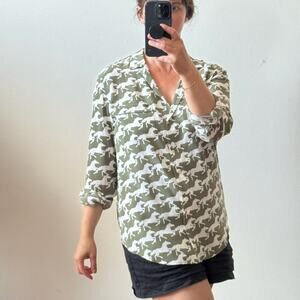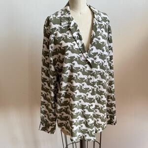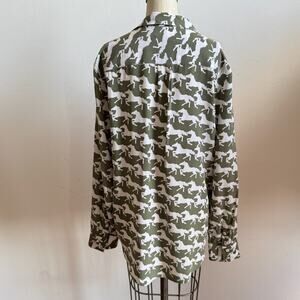 EQUIPMENT FEMME Sage Green Horse Print 100% Silk Long Sleeve Collared Blouse Top