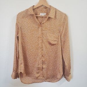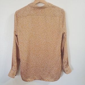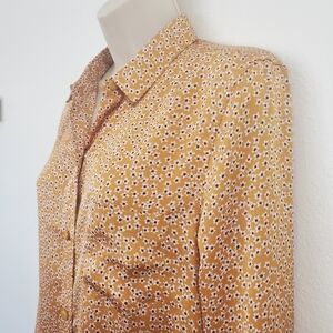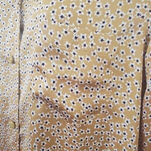 Yellow button-down shirt with a ditsy floral microprint and accent pocket. Adjustable cuffs. 100% polyester. Relaxed fit. Size S. EUC.