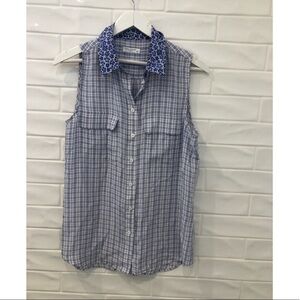 A floral fold-over collar adds a hit of contrast to this plaid equipment blouse. Flap pockets frame the buttoned placket. Shirttail hem. Sleeveless. Fabric: silk crepe. 100% silk. Dry clean. Measurements length: 26in / 66cm