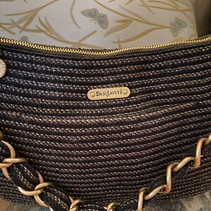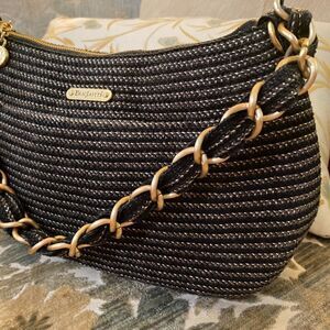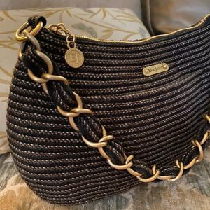 ERIC JAVITS CLASSY BLACK & GOLD WEAVE SHOULDER BAG WITH GOLD CHAIN HARDWARE