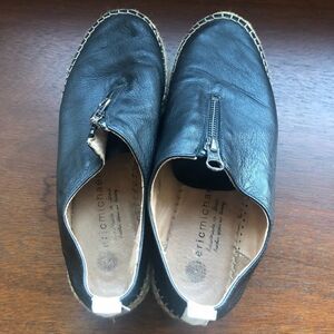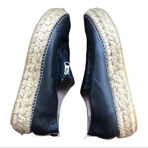 Eric Michael Serena Black Leather Espadrilles with white back stripe detail. Size 37 (6.5)Made in Spain. Leather upper. Leather lining. Synthetic sole. 1 1/2" Platform Height. Zipper detail.
