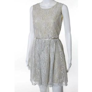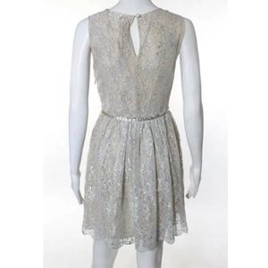 Erin Featherston Silver So Delicate Dress, Crew neck sleeveless key hole back with zipper fit and flare lace overlay