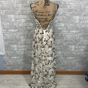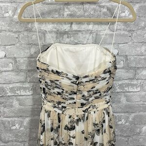 Lush flowers shower the ruched strapless bodice of a flowing chiffon gown further enriched by a finely shirred skirt and sweeping hemline.