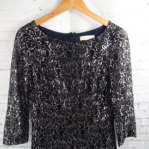 BLACK & SILVER LACE LONG SLEEVE ROUND NECK EVENT WEDDING PARTY DRESS SIZE 8 BY ERIN FETHERSTON PRE OWNED LIKE NEW CONDITION