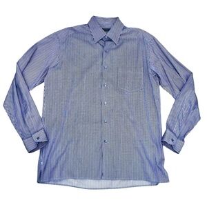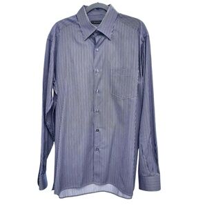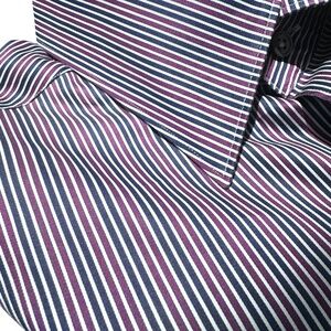 Ermenegildo Zegna navy blue, burgundy and white striped button down dress shirt. In excellent preowned condition. Pocket on the front left. Variations in color are due to lighting.