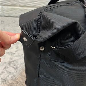 New without tags large duffel bag from ERMENEGILDO Zegna Parfums. Lightweight but lined and foldable for travel. Snaps on each side to make a bit smaller. Adjustable crossbody strap. Vegan leather trim with the nylon.