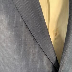 ERMENEGILDO ZEGNA suit in a navy and blue striped wool with a full liner and includes a single breasted, double button sport coat with a notch lapel and matching pleated trousers. Made in Italy.