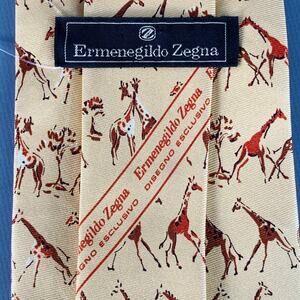 ERMENEGILDO ZEGNA necktie in a yellow silk twill featuring a red and orange giraffe pattern.