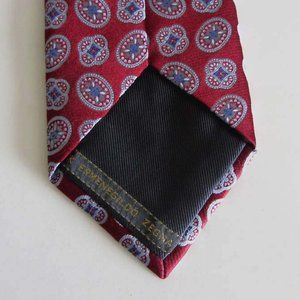 Men's classic ERMENEGILDO ZEGNA neck tie featuring a pointed tip, an adjustable fit and geometric medallion pattern throughout. Color: burgundy & light blue. Fabric: 100% Silk. Dry clean. Made In Italy. Condition: Excellent new without tag.