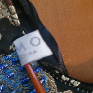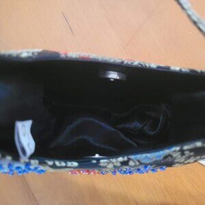 Design: Rich black fabric featuring a detailed floral brocade or tapestry. The vibrant red, blue, and gold flowers are stunningly embellished with glass seed beads and colorful embroidery.