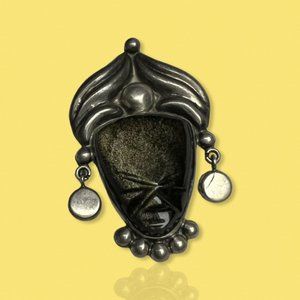 ERR Mexico Sterling 925 Brooch Pendant Carved Aztec Warrior Face Green Onyx?