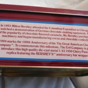 This collectible was made by Ertl in 1994 to commemorate Hershey's 100th anniversary. The van is approx. 4 1/2" L, 5/8" W, and 1 5/8" tall. The tin has some wear. The van has some wear/scratches. Still nice and shiny and the wheels roll also.