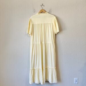 The ESBY Pippa Shirt Dress in pastel yellow is a stylish and versatile piece for women. Made from 100% cotton with a woven fabric type, this dress features a collared neckline, short puff sleeves, and a button closure. The tiered swing flowy design and layered accents make it perfect for casual or travel occasions in the summer or spring seasons. With its classic and preppy style, this maxi dress also includes pockets for added functionality. Made by Esby in the United States, this women's shirt dress in size M is sure to elevate any wardrobe with its lightweight and breathable material.