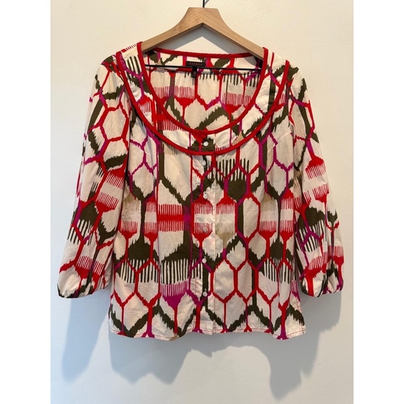 Features: Rounded neckline with red piping, 3/4 sleeves, Button-front placket, Geometric ikat pattern