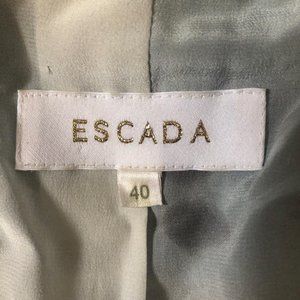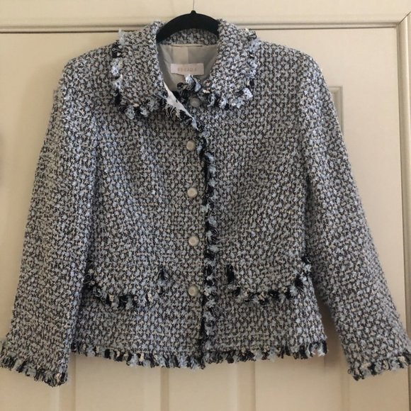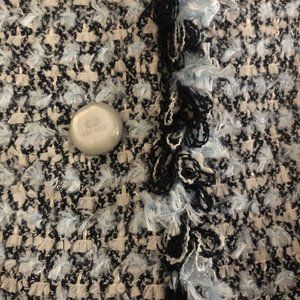 Channel your inner Audrey Hepburn in this beautiful boucle jacket from ESCADA. With shades of sky blue, black and white coming together with beautiful fringey edges, pearly buttons and a floral lining that is to die for, this jacket has all of the high-end details you've come to expect from ESCADA and will look great over that little black dress or a pair of jeans. These photos don't do it justice. This jacket is in excellent pre-loved condition.