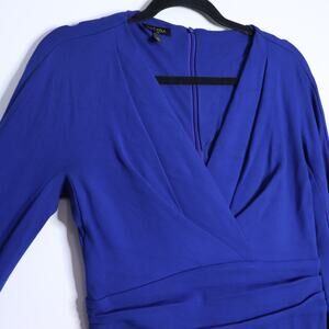 Jersey knit knee-length dress in cobalt blue. V-neck wrap bodice and ruched waist. Long sleeve with discreet back zip closure.